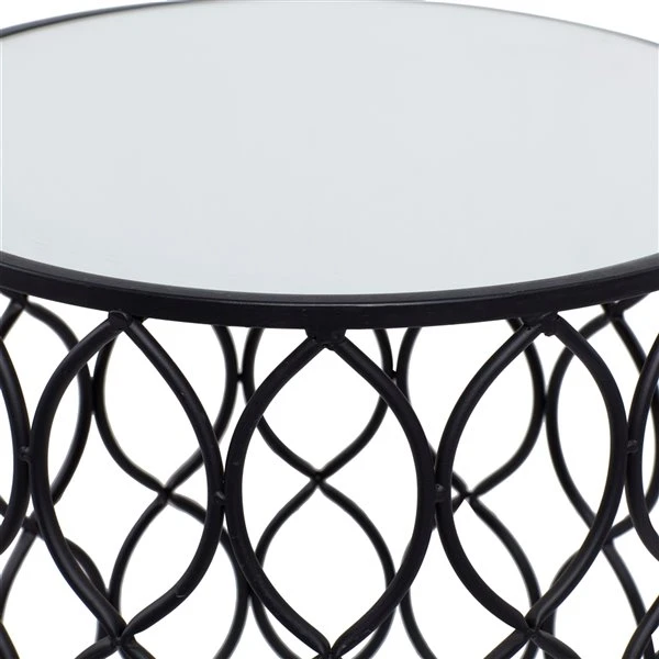 - This contemporary round accent table highlights a reflective glass top and black metal frame with an open design