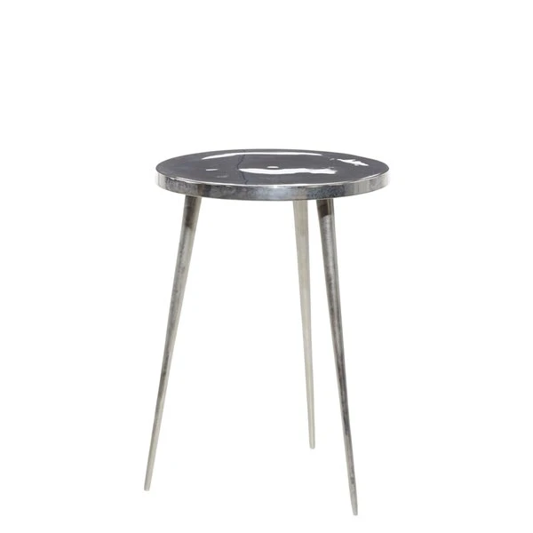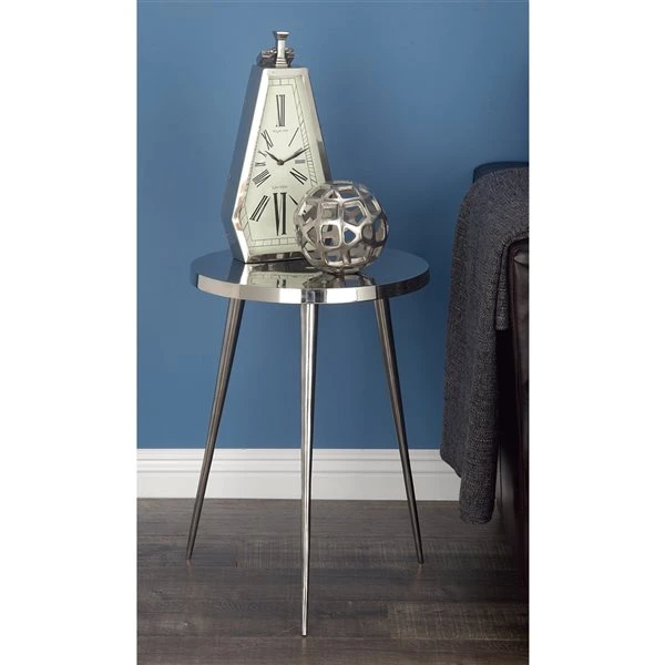 - This contemporary accent table highlights a high gloss metallic silver smooth finish