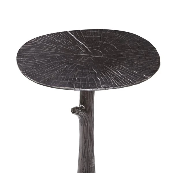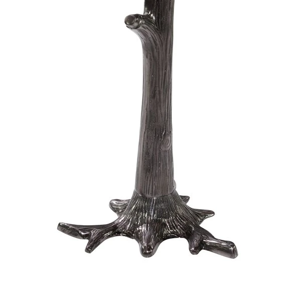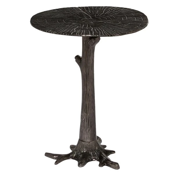 - Solid aluminum table base crafted into a metallic gunmetal grey tree trunk