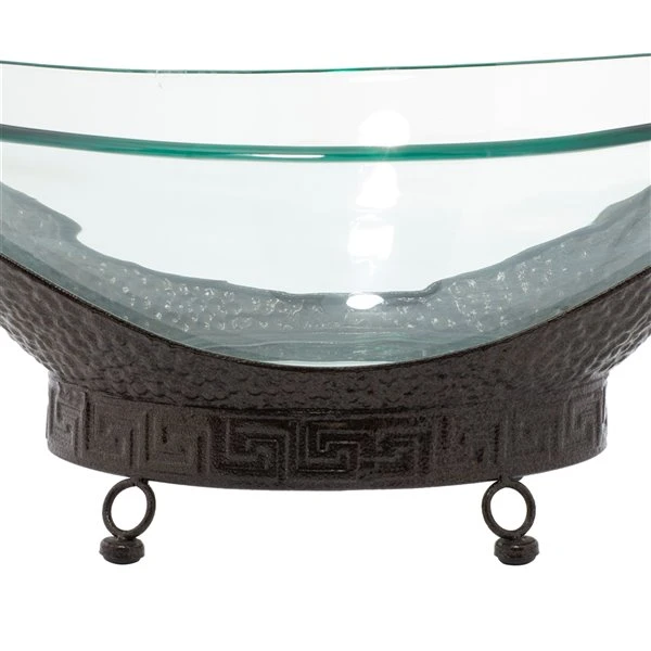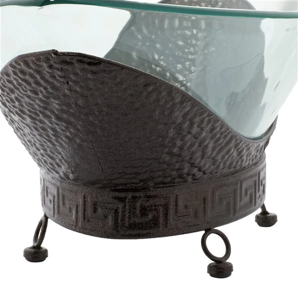 - Matte dark brown and black iron frame with decorative looped feet and hammered metal throughout the leaf-shaped sides