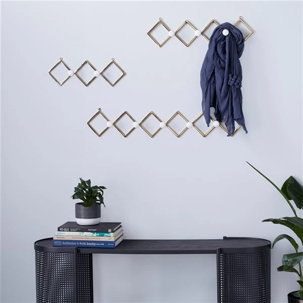 - Geometric patterned design with pearl-inspired knob hooks