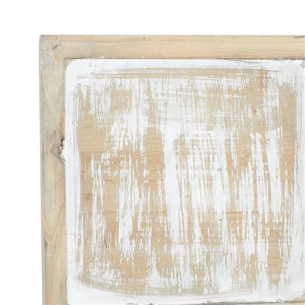 - Features a square wooden frame in distressed brown and grey finishes with whitewashing