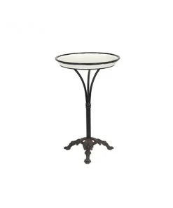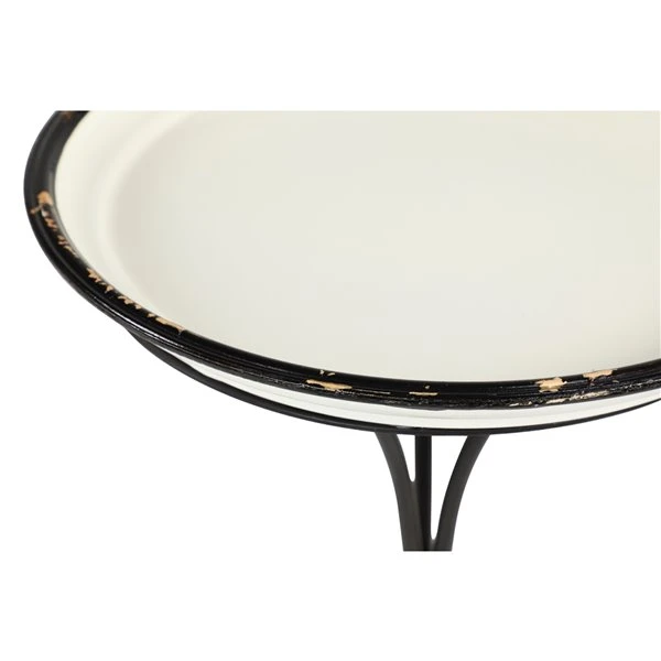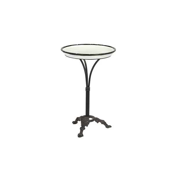 - Vintage decor table with black iron rim around the round white enamel top and black iron body and ornate black base
