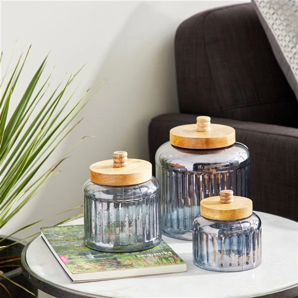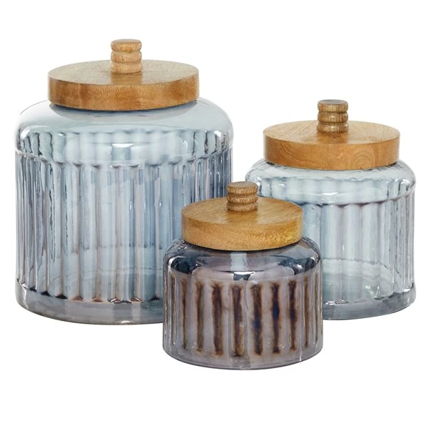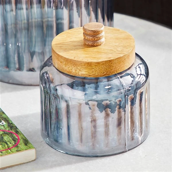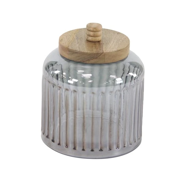 - This farmhouse style inspired design grey glass jar set with wooden lids features a cylindrical body with vertical groove patterns and a natural wood grain circular lid