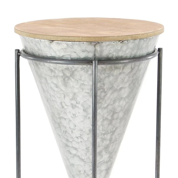 - This stunning metal drum table features a hammered grey iron finish, polished dark grey iron finish, and natural brown wooden finish