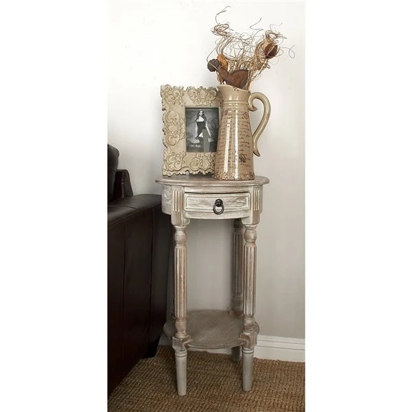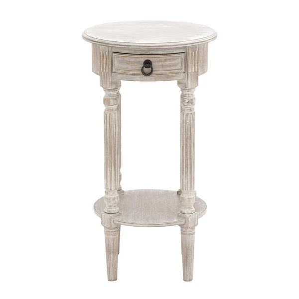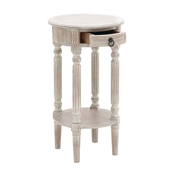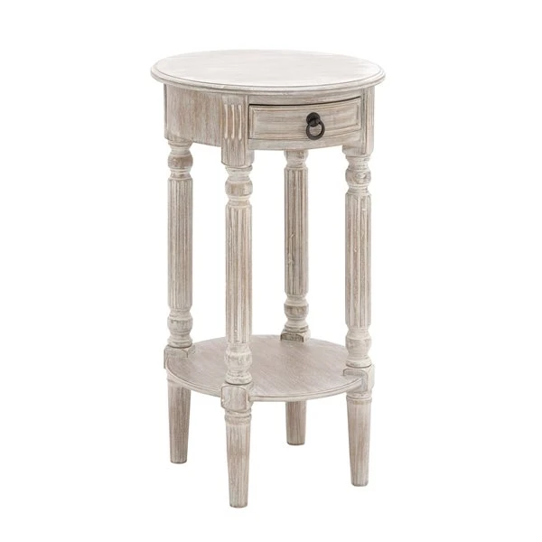 - Features a round-shaped table with extra drawers and whitewashed taupe finishing