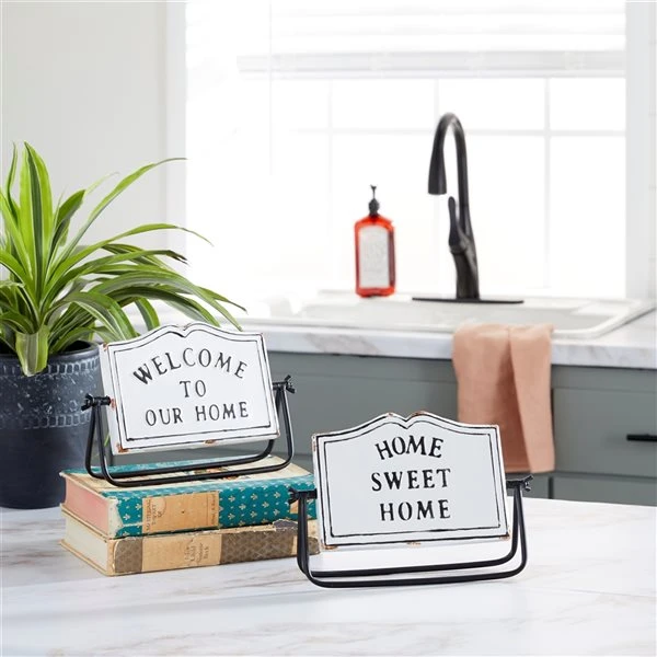 - Features 2 identical, vintage-inspired signs: Welcome to our home and Home sweet home