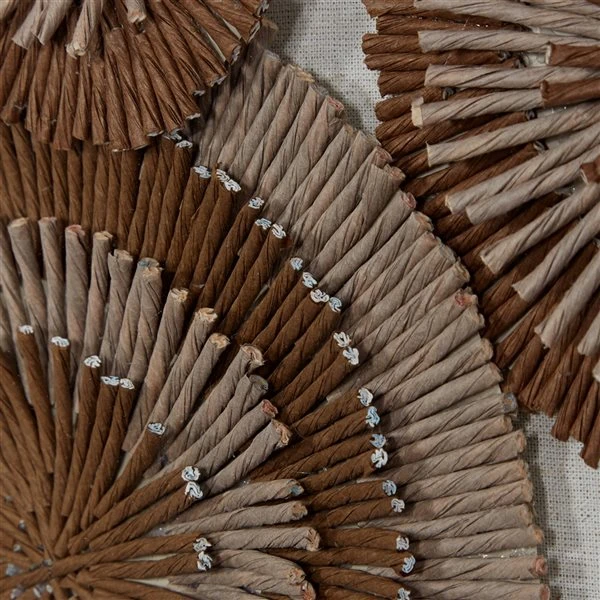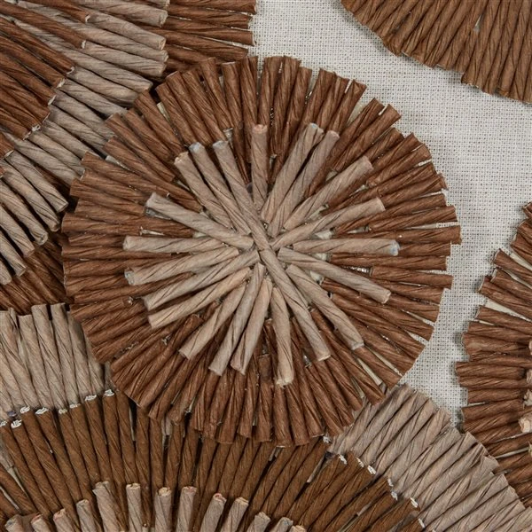 - Tan and brown string forming round striped flowers over wheat beige canvas