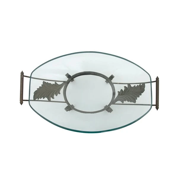 - Clear glass and metal stand with rectangular bar handles and scrolled band feet