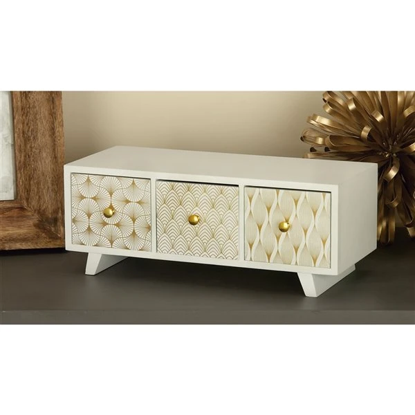 - White jewelry box for organizing your accessories, features three drawers with eye-catching gold patterns and iron knobs