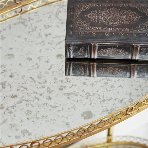 - An oval-shaped rolling iron cart with reflective glass and round wheels