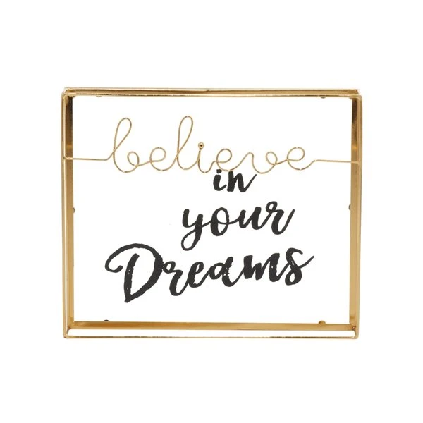 - Features the words “Believe in your dreams” in a cursive script