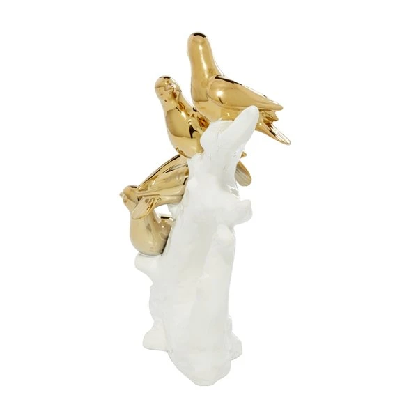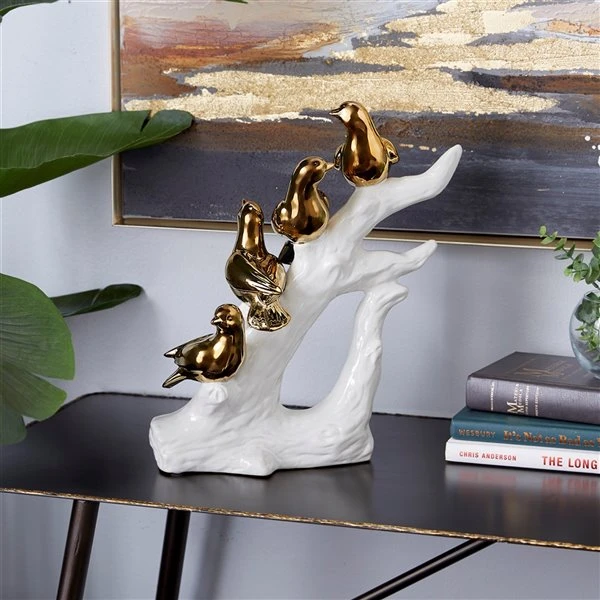 - A polished table decoration that comes with 4 gold birds resting on a white large branch serving as a stable base