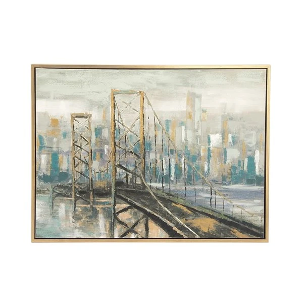 - Features a metallic gold finish frame and a rope bridge painting canvas in black, metallic gold, white, turquoise, light blue, and smoky grey finish