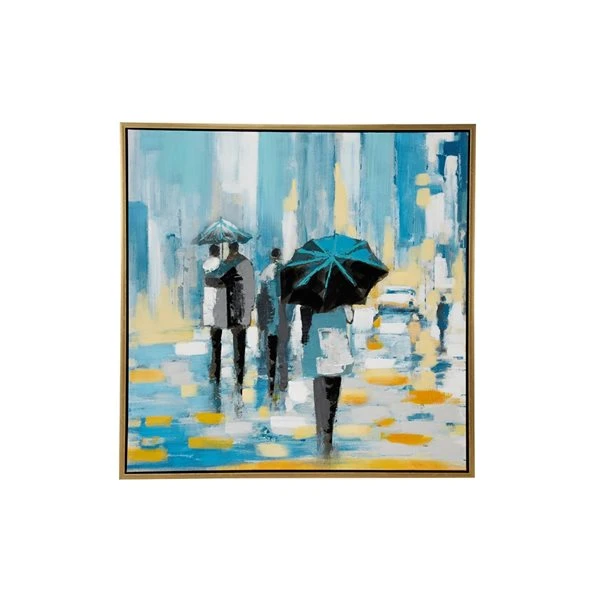 - Long and fluid brushstrokes forming a vertical rain with people walking in rain with their umbrellas