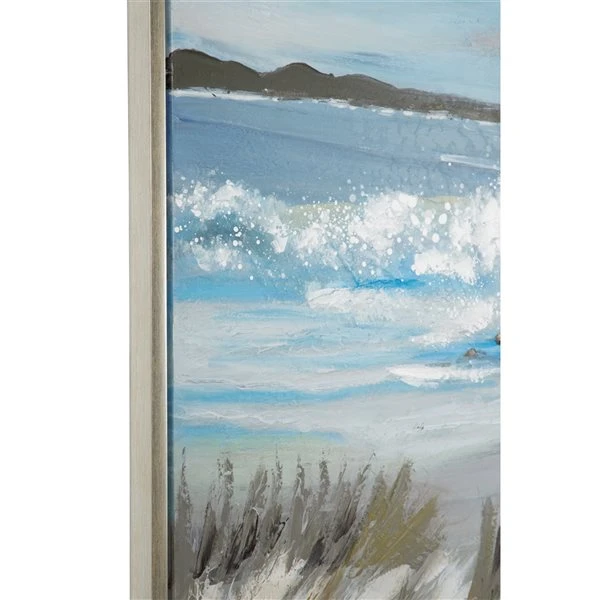 - This beach scenery wall art is made of polystone, wood and canvas materials
