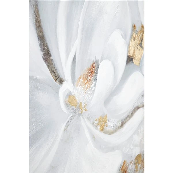 - Features a metallic gold wooden frame and an acrylic-painted canvas in a grey, white, bronze, gold and black palette