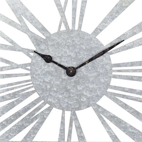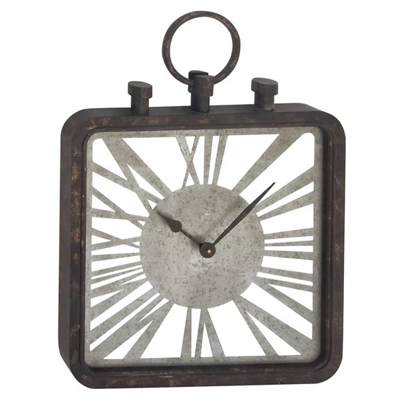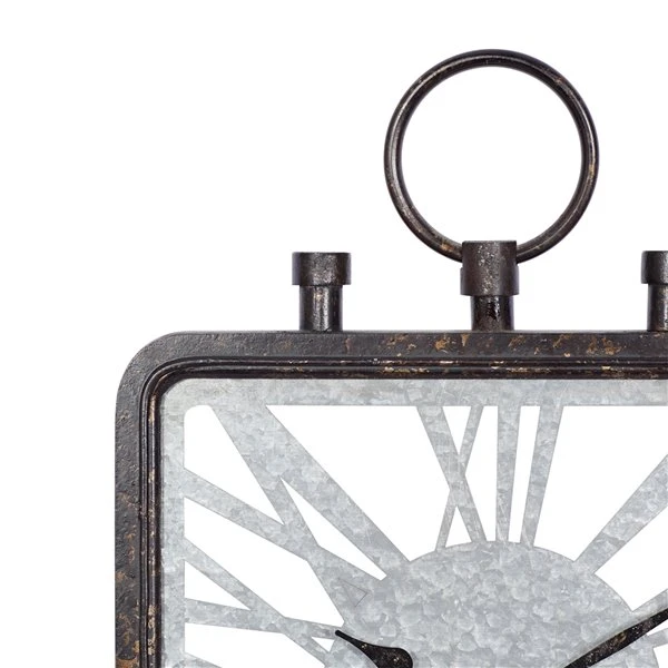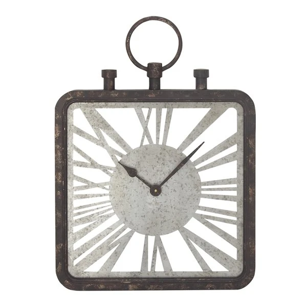 - This vintage-inspired clock features a square shape with an open-style clock face design and a loop ring hanger carving at the top
