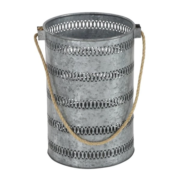 - Galvanized pierced metal buckets with woven natural beige jute rope handles