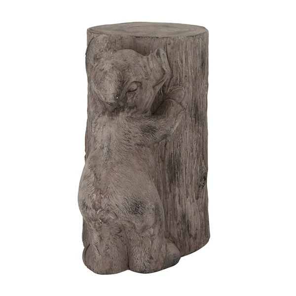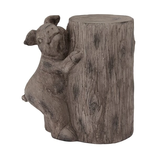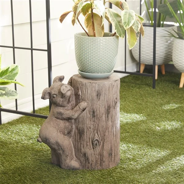 - This pig garden statue features a happy pig with floppy ears hugging a cut tree log