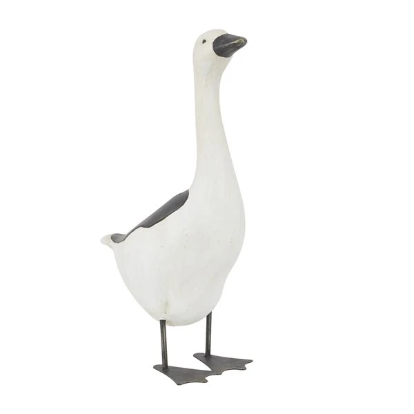 - A lifelike standing goose poses for this garden sculpture featuring its bill, webbed legs, and back feather in a dash of grey