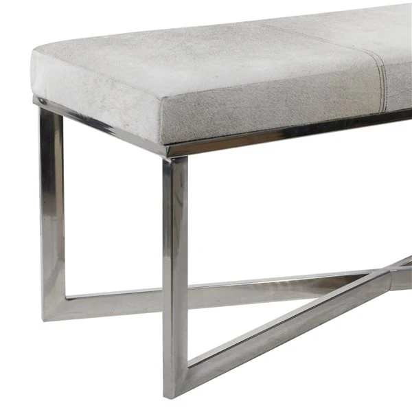 - Seating bench built on a lightweight, metallic silver stainless steel frame with MDF board seat wrapped in white and grey cowhide