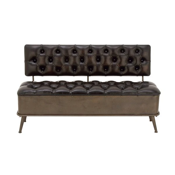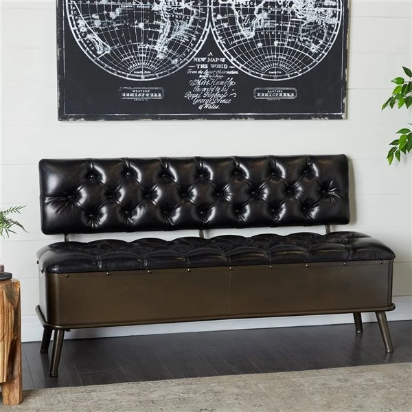 - This industrial style inspired design black iron and leather storage bench is the perfect display in your living room for both style and purpose