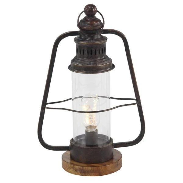 - Solid iron lantern housing with clear hurricane glass light bulb cover and natural mango wood base