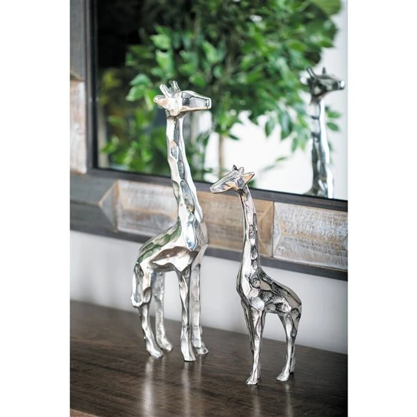 - This sculpture set features 2 giraffes standing upright in a glossy, elegant and metallic vibe