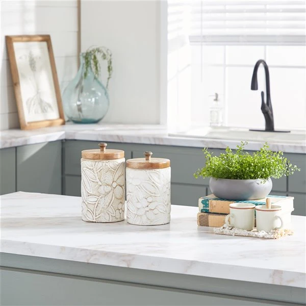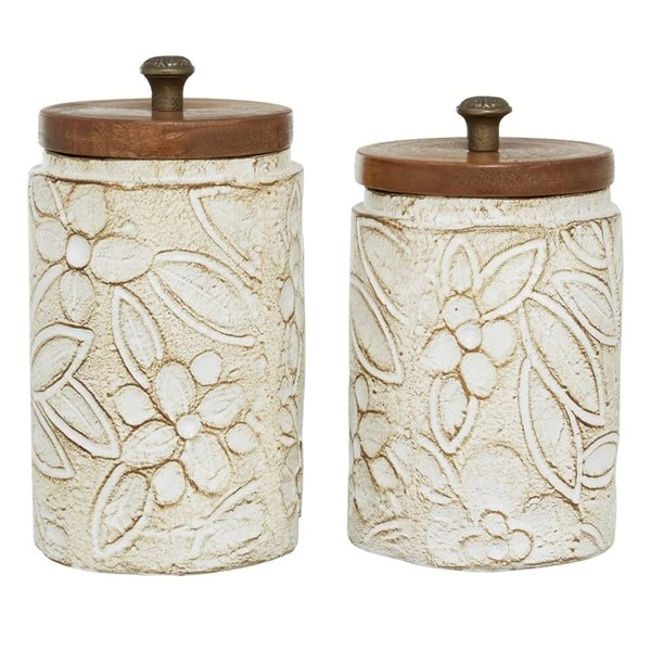 - This farmhouse style inspired design white dolomite ecomix jar set features a beautiful flower and leaf engraved design on the surface furnished with wooden lids