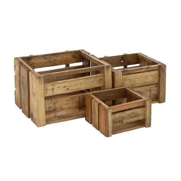 - Natural pine and mango wood box crates with distressed mocha and light brown wood planks nailed together form storage crates with vertical and horizontal slats