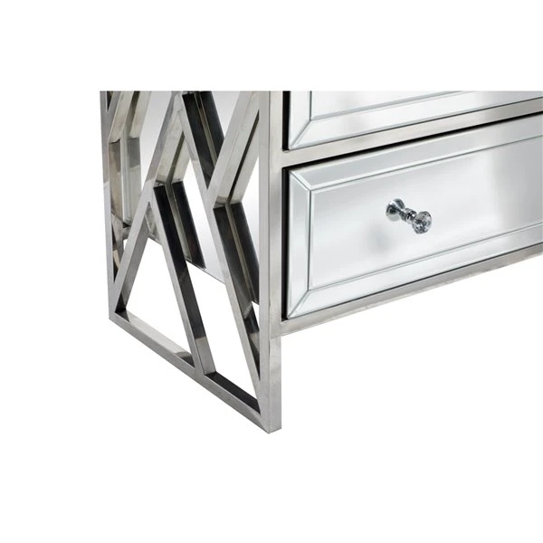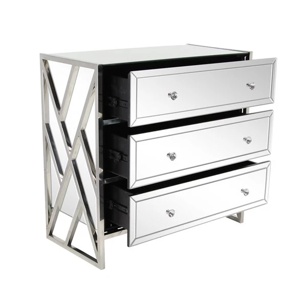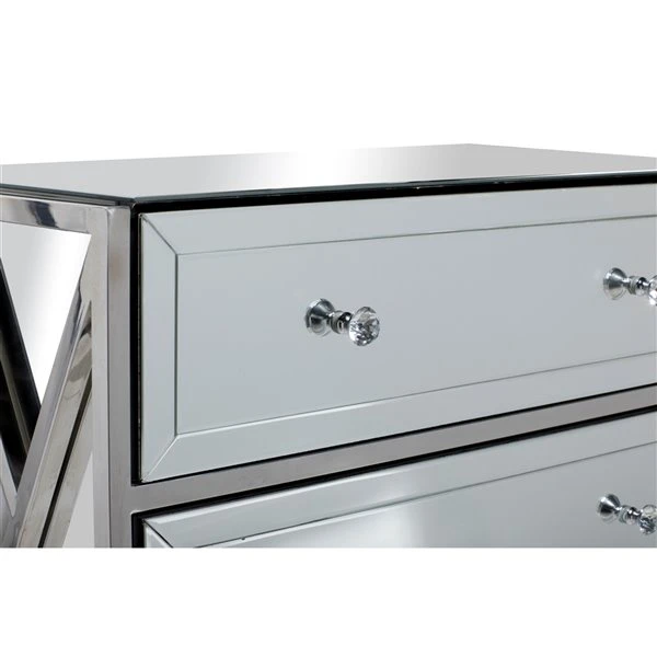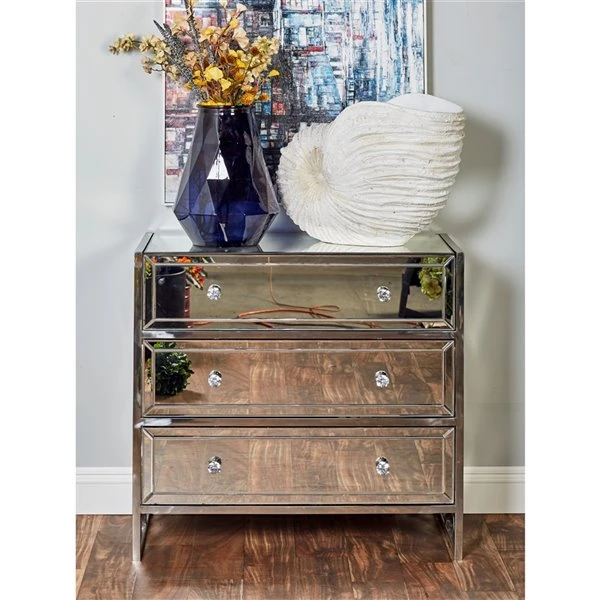- This accent 3 chest drawer highlights a silver frame finish with mirror cutout panels that gives off a silver reflection