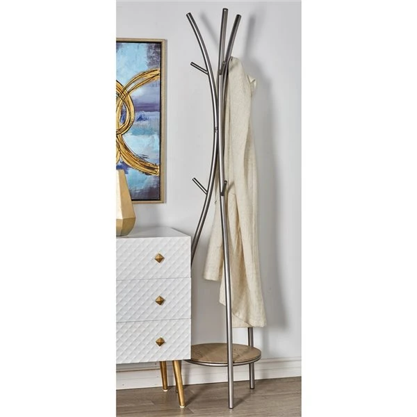 - This metal coat rack has a sleek, silver finish for a modern aesthetic