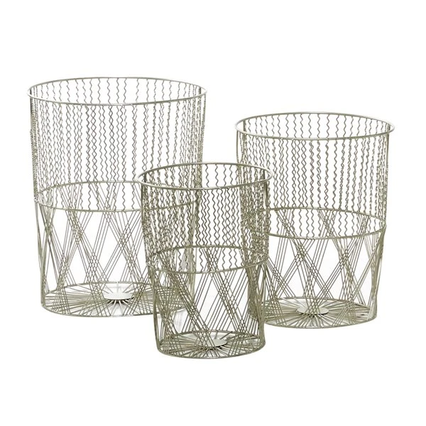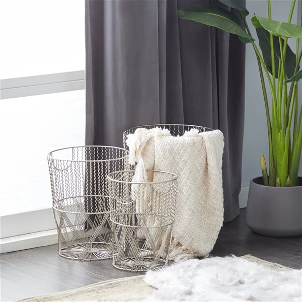 - This 3-piece wire basket storage set comes in a metallic silver finish