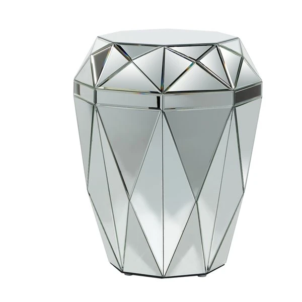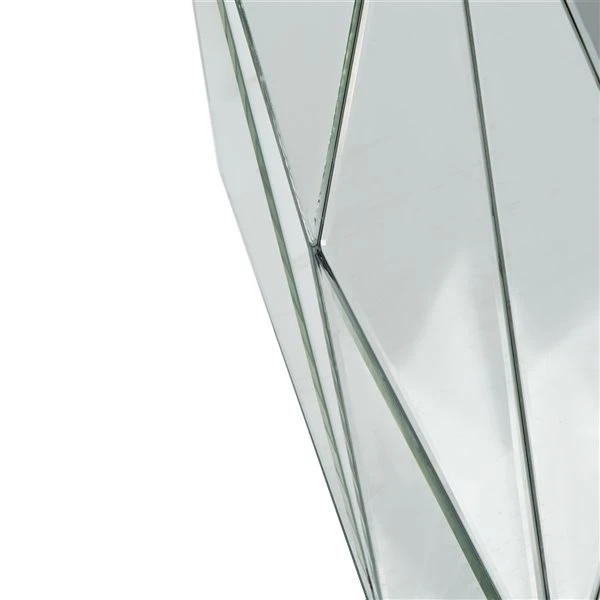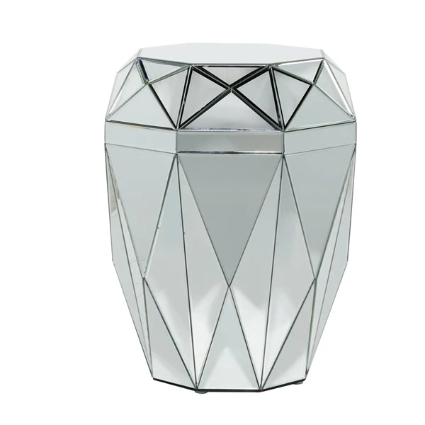 - This round silver geometric mirrored side table comes in a sophisticated silver finish that suits any glam-inspired interior design