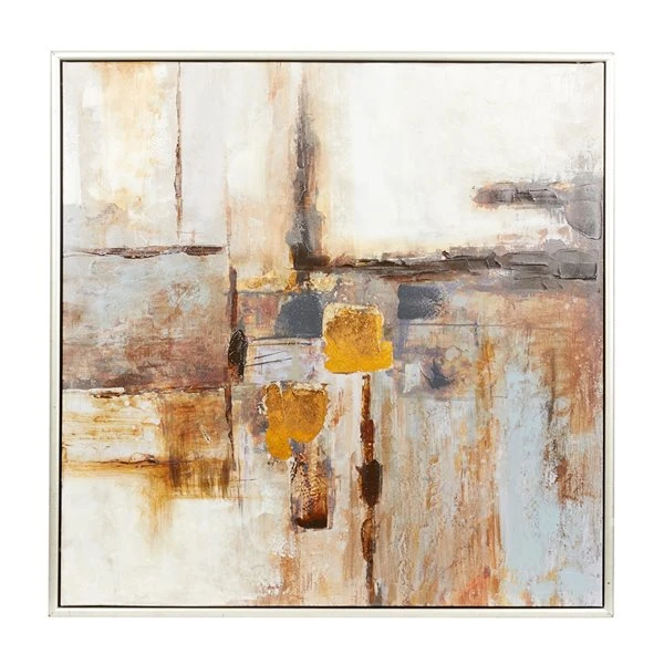 - It features a metallic silver frame and a canvas with a metallic gold, brown, chocolate brown, black, smoky white and grey palette