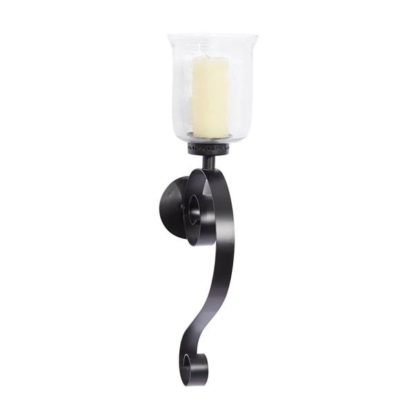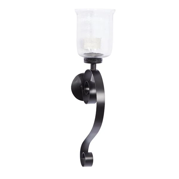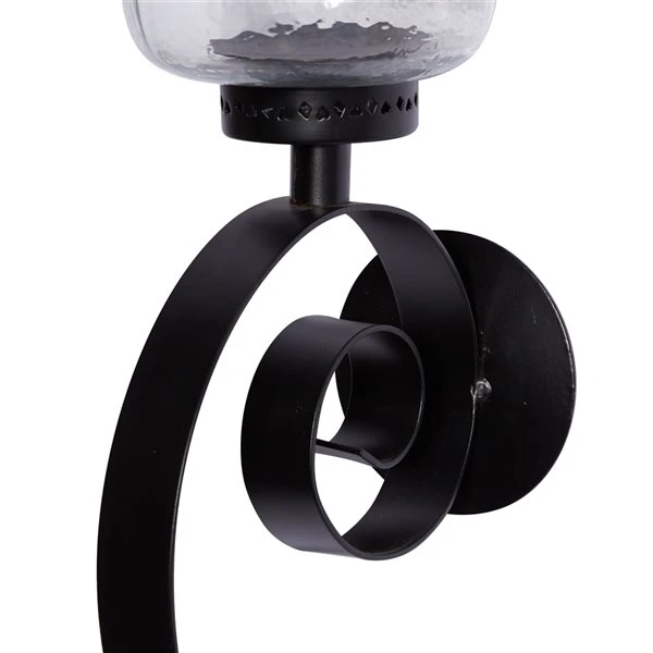 - Black finish over scrolled arm with textural transparent hurricane glass top