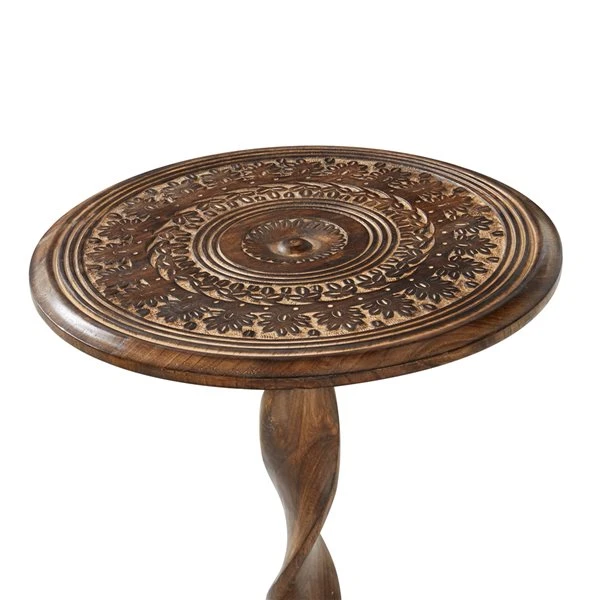 - A circular accent table features a mocha brown natural wood