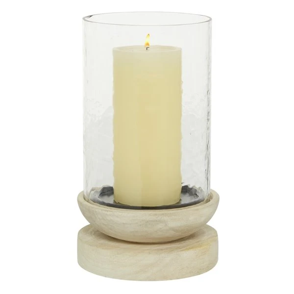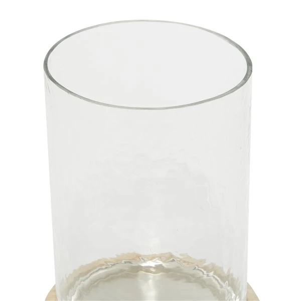 - This candle holder has a tall cylindrical hurricane glass with a round bottom