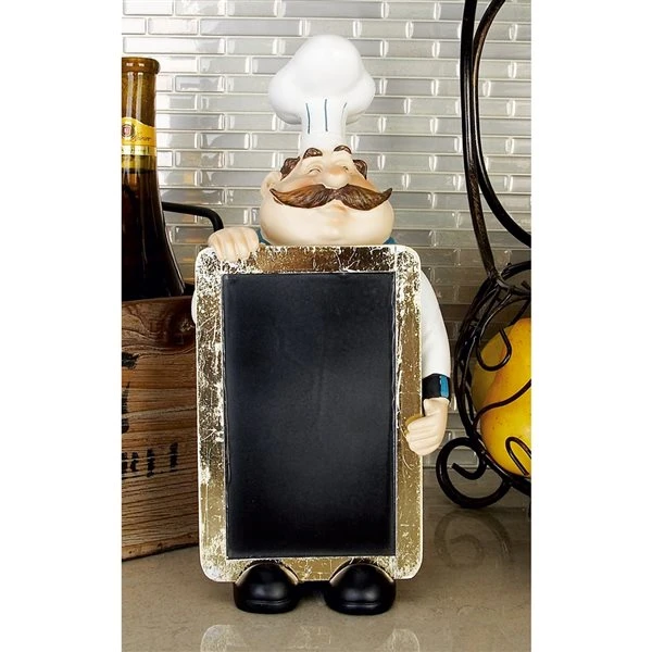 - Features a chef with a chalkboard made of polystone