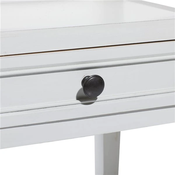 - Accent table with a smooth surface has a matte white finish and black knobs