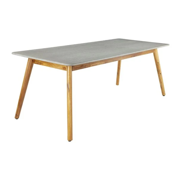 - This grey outdoor dining table has a lightweight and durable polycement tabletop and 4 mould and water-resistant acacia wood legs