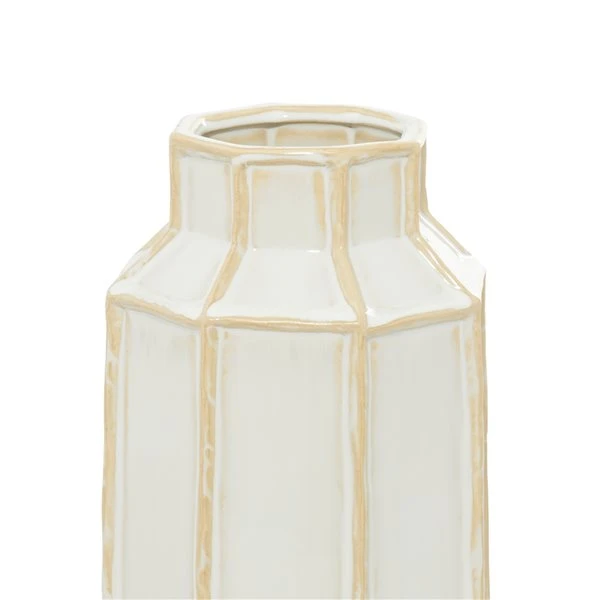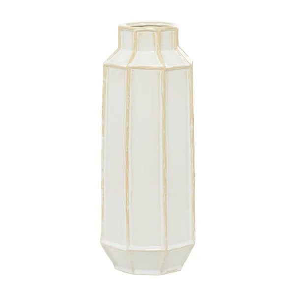 - Glossy eggshell white finish with warm beige vertical glaze accents