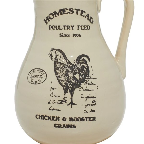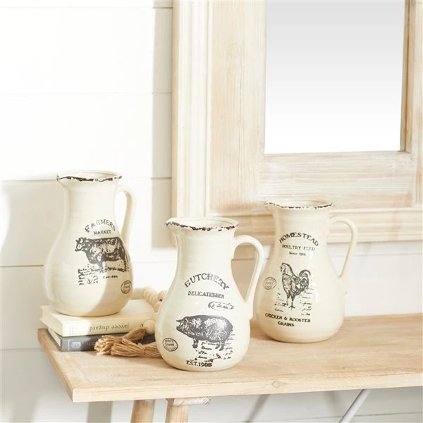 - Oinochoe-style vases with vintage-stamped farmhouse texts and illustrations