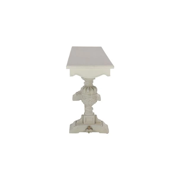 - This wood table’s soft, off-white and grey colours, speckled texture, and ornately carved columns bring the romantic, antique look of the French countryside into your home