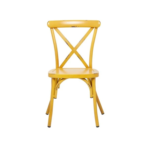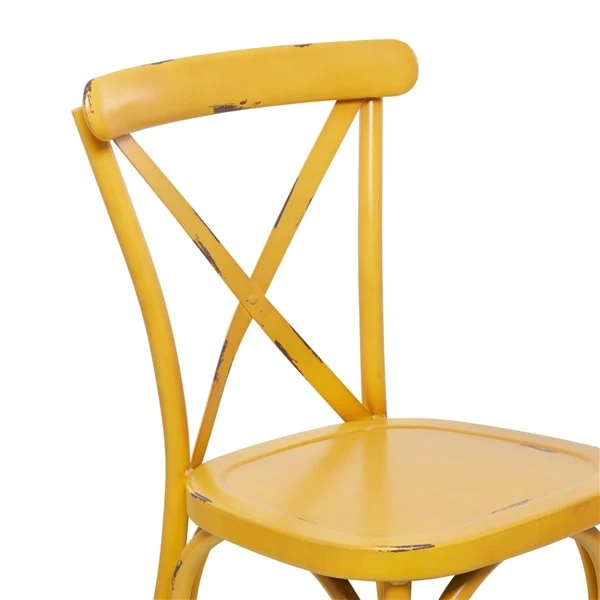 - This dining chair highlights a distressed vivid mustard yellow finish for a vintage-inspired look